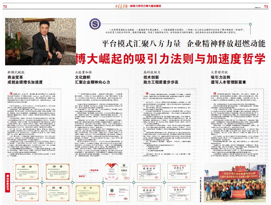 為更全面地介紹博大的發展經驗,《中華建筑報》第2982期以特刊的形式,通過四個版面詳細講述“博大崛起的吸引力法則與加速度哲學”。全文摘錄如下,以饗讀者。